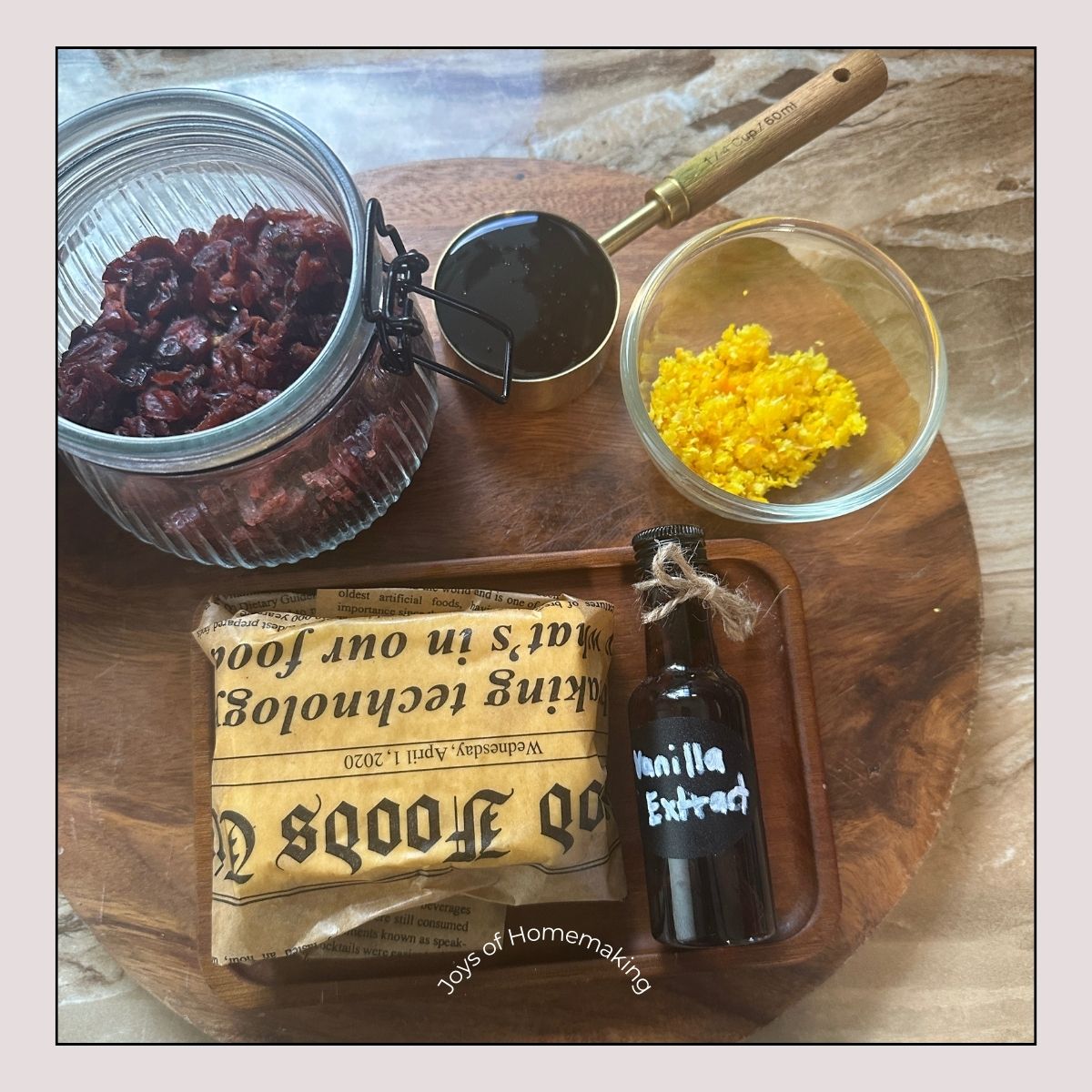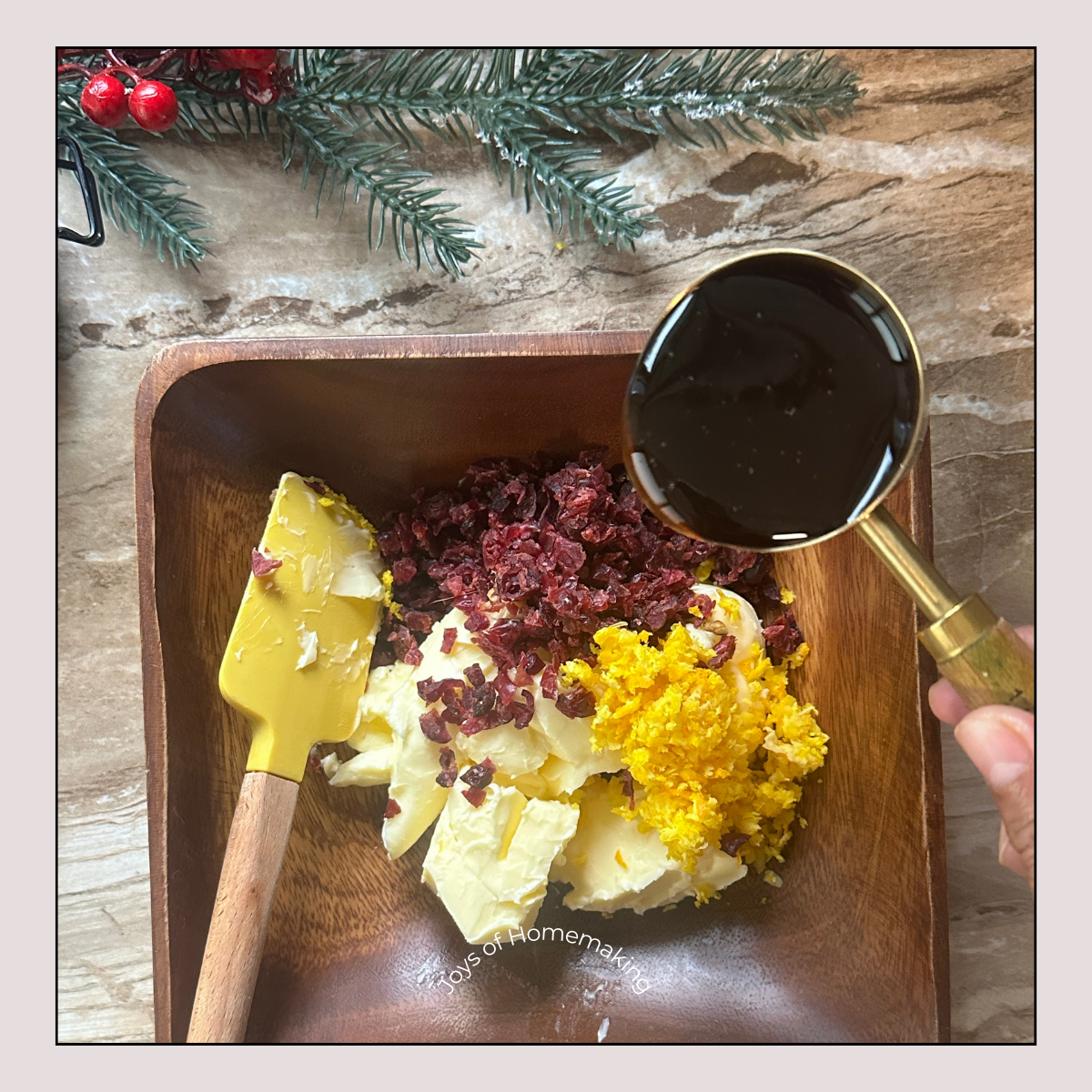 Using a spatula, simply mix the ingredients—dried cranberries, vanilla extract, honey, butter, salt and orange zest—in a bowl. Mix well.