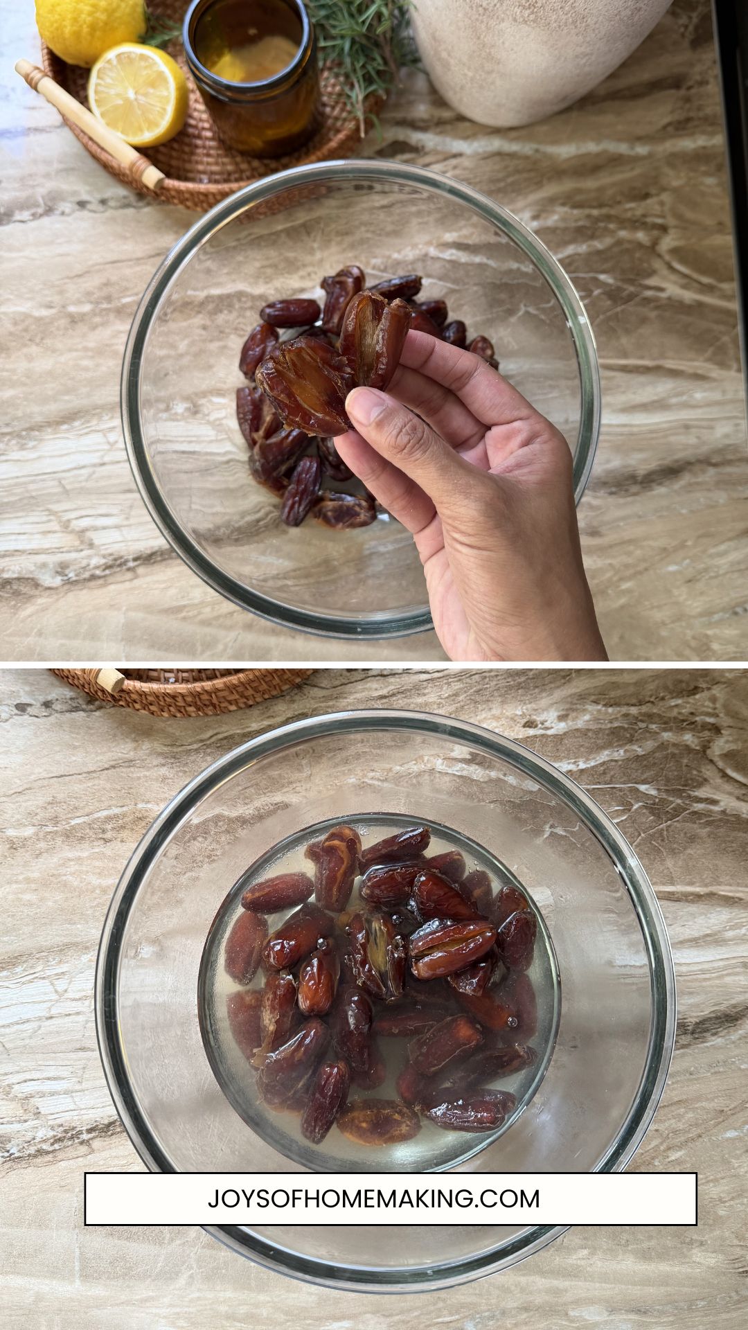 - Place dates in a bowl and cover with warm water. Soak for 10 to 15 minutes.