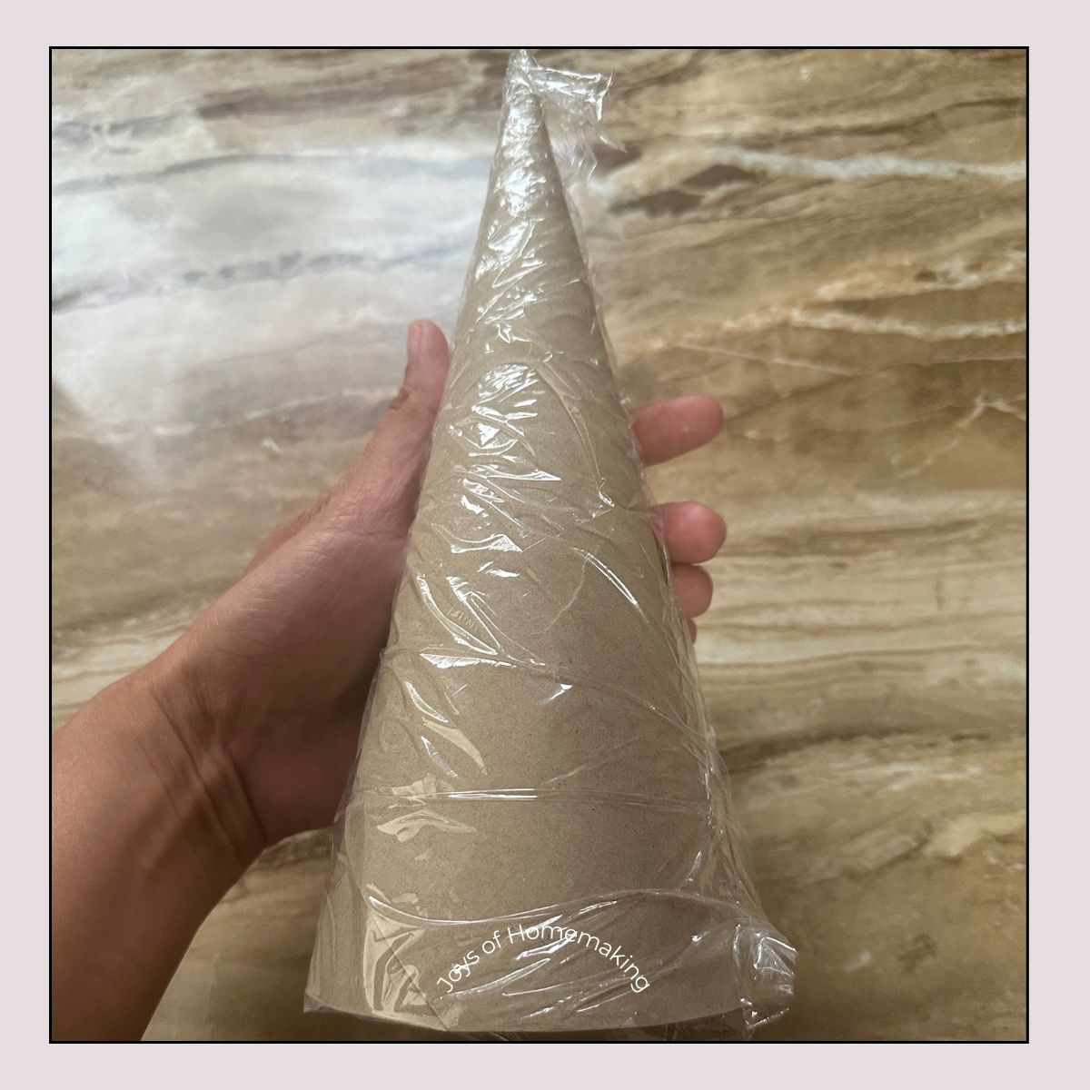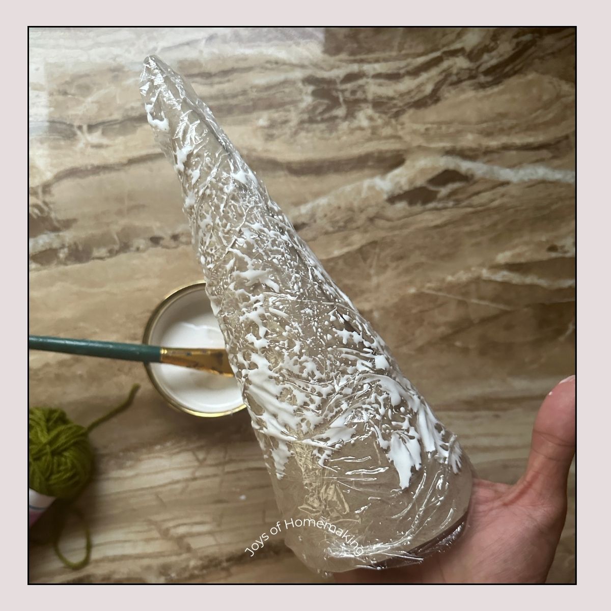 Wrap the entire cone in cling wrap (plastic wrap). This makes it so much easier to slide your finished yarn tree off the form later without tearing or bending it.