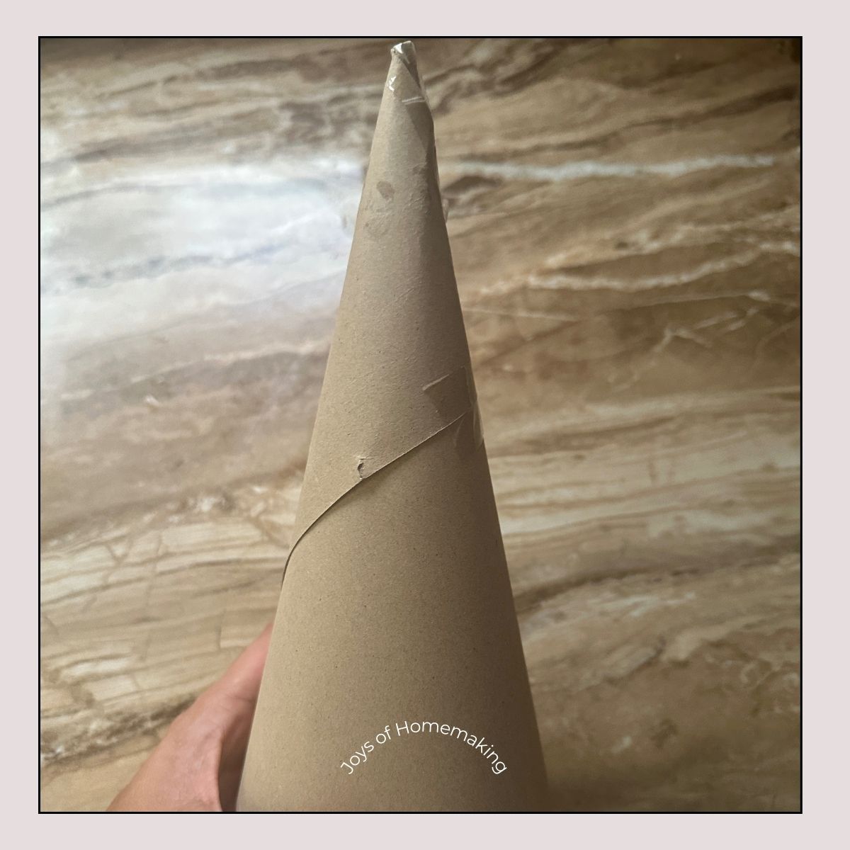 Roll a piece of cardboard into a cone shape. Adjust it until you get the size you want, then trim the bottom so the cone can stand flat on the table. This will serve as the form for your yarn tree.