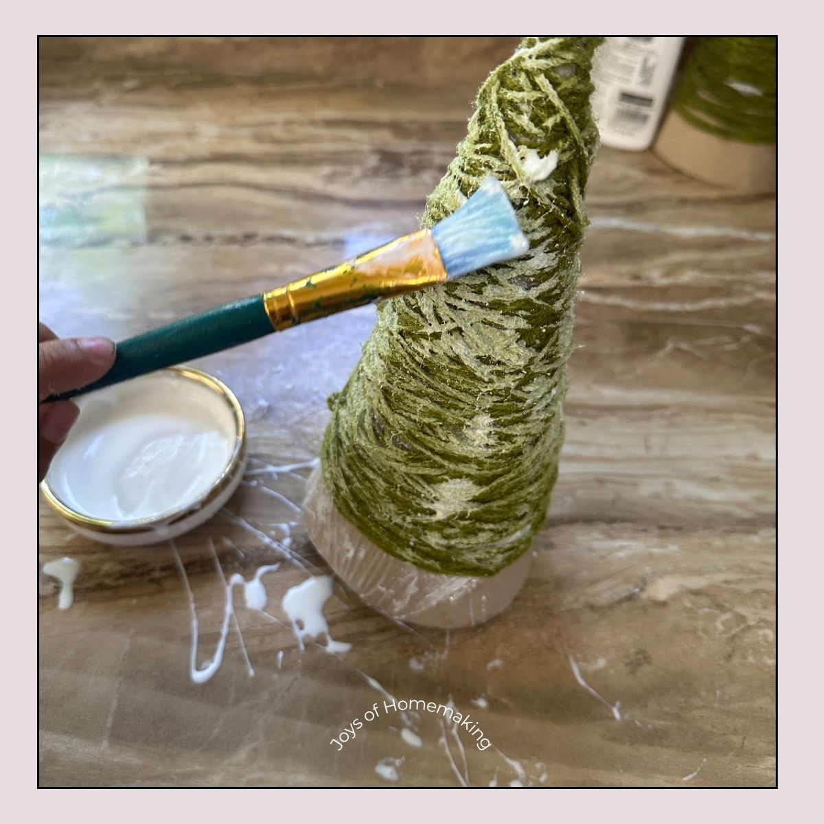 Once the shape looks how you want it, gently brush another layer of white glue over the outside of the wrapped yarn. This helps everything set firmly in place and gives your finished tree a nice, sturdy structure.