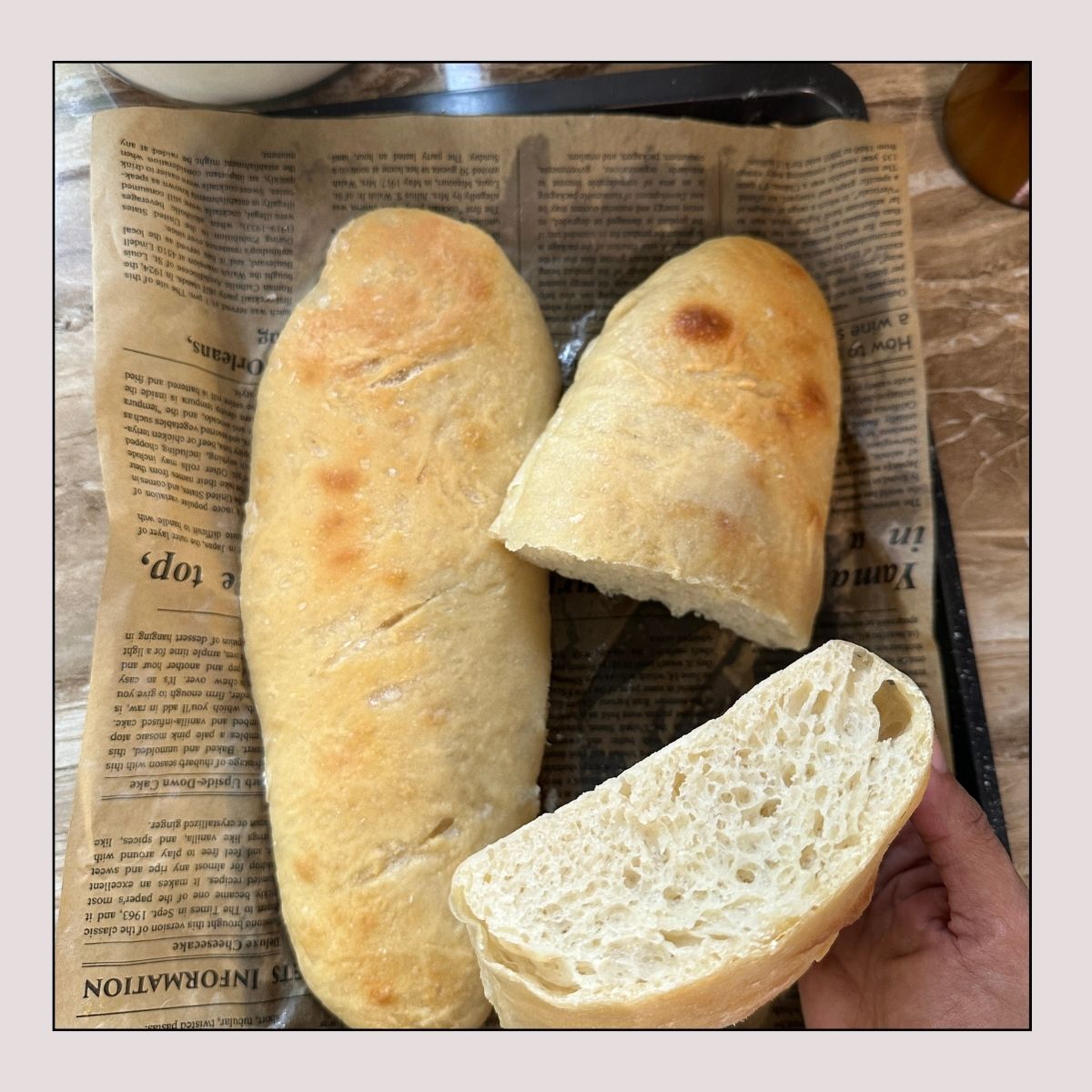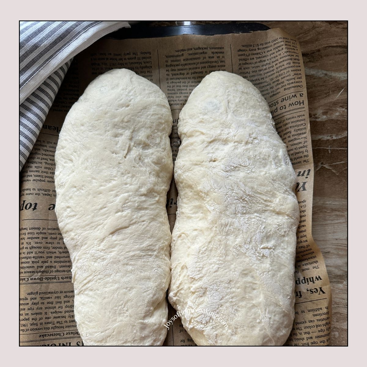 You can also divide it in half and shape each piece into a baguette-style loaf. I just cut the dough into two pieces, then gently stretch and roll each one into a simple baguette shape.